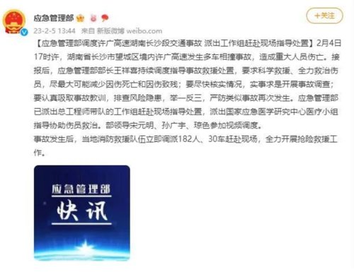 2月4日17时许,湖南省长沙市望城区境内许广高速发生多车相撞事故,造成重大人员伤亡。接报后,应急管理部部长王祥喜持续调度指导事故救援处置,要求科学救援、全力救治伤员,尽最大可能减少因伤死亡和因伤致残;要尽快核实情况,实事求是开展事故调查;要认真吸取事故教训,排查风险隐患,举一反三,严防类似事故再次发生。应急管理部已派出总工程师带队的工作组赶赴现场指导处置,派出国家应急医学研究中心医疗小组指导协助伤员救治。部领导宋元明、孙广宇、琼色参加视频调度。