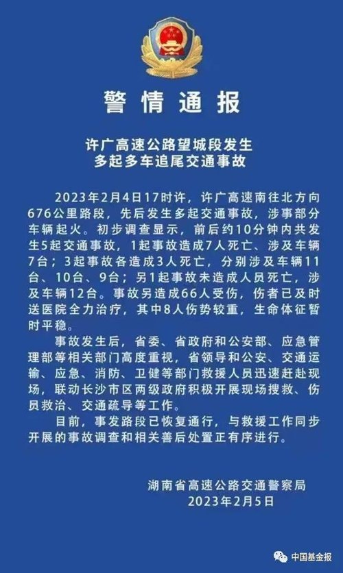 2023年2月4日17时许,许广高速南往北方向676公里路段,先后发生多起交通事故,涉事部分车辆起火。初步调查显示,前后约10分钟内共发生5起交通事故,1起事故造成7人死亡、涉及车辆7台,3起事故各造成3人死亡,分别涉及车辆11台、10台、9台;另1起事故未造成人员死亡,涉及车辆12台。事故另造成66人受伤,伤者已及时送医院全力治疗,其中8人伤势较重,生命体征暂时平稳。