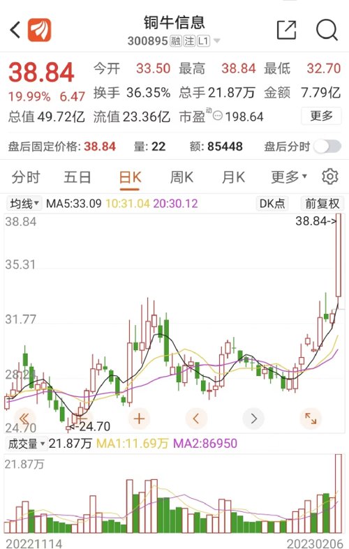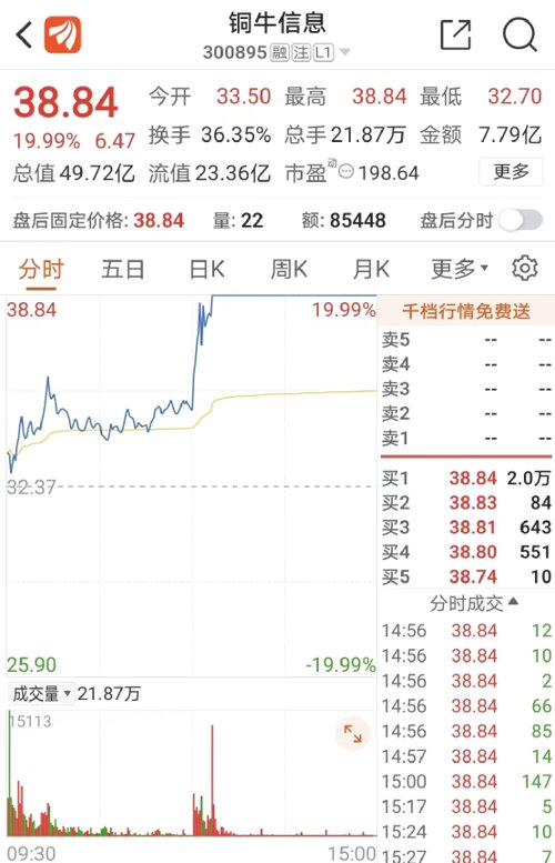 2月6日下午一开盘,铜牛信息股价直线拉升,不久即封住涨停板,大涨19.99%。