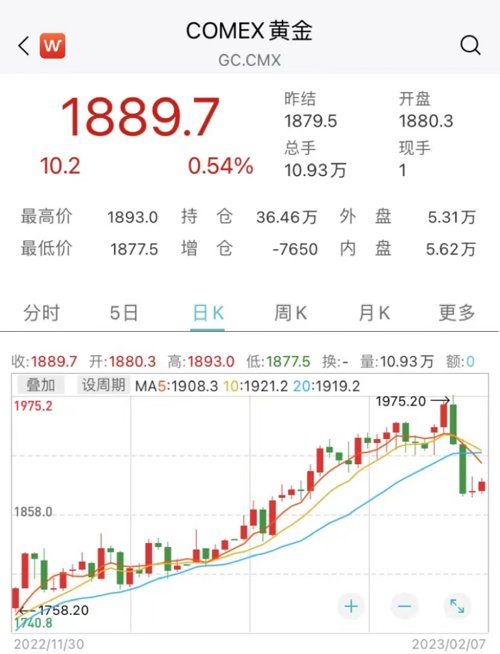 从COMEX黄金价格走势来看,去年11月份以来,黄金价格一路震荡攀升,并一度上涨至1975.2美元/盎司,创阶段新高。但近期受美国非农就业数据超预期、美联储加息步伐放缓等因素的影响,黄金价格有所回落。截至目前,现货黄金价格为1889.7美元/盎司,年内累计涨幅超3%。
