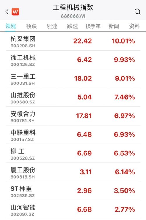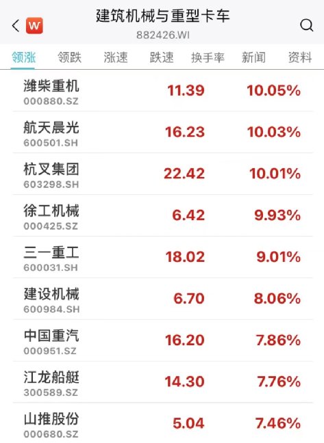 同时,建筑机械、重型卡车全线爆发,潍柴重机、航天晨光、杭叉集团等多股涨停,中国重汽、山推股份、江龙船艇涨超7%。