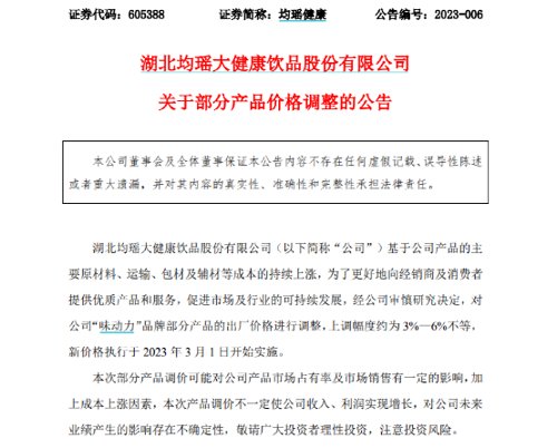2约12日,均瑶健康宣布,将对“味动力”品牌部分产品出厂价格进行调整。均瑶健康公告表示,基于公司产品的主要原材料、运输、包材及辅材等成本的持续上涨,为了更好地向经销商及消费者提供优质产品和服务,促进市场及行业的可持续发展,经公司审慎研究决定,对公司“味动力”品牌部分产品的出厂价格进行调整,上调幅度约为3%—6%不等,新价格执行于2023年3月1日开始实施。