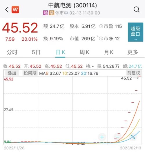 今日开盘,中航电测再度一字涨停,实现8连板,股价报45.52元/股,股价刷新历史新高,总市值约269亿元。2月2日以来,中航电测累计涨幅超330%,成为年内涨幅最大的个股。