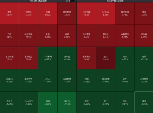 板块方面,大基建、工程机械板块集体走高,多股涨停,白酒股全线走强;而海运、航运概念跌幅居前,养殖股盘中跳水,ChatGPT概念热度回落走势分化。