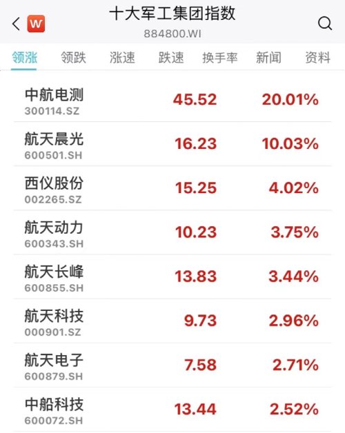 与此同时,带动军工股早盘走强,中科海讯20CM涨停,航天晨光涨停,新余国科、天和防务、中国海防涨超5%,西仪股份、全信股份、景嘉微等跟涨。