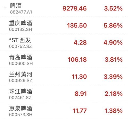 同时,啤酒股集体上涨,重庆啤酒、青岛啤酒、兰州黄河涨超3%,威扬酒业控股涨3.7%,华润啤酒、百威亚太跟涨。饮料制造板块跟涨,李子园、香飘飘涨超5%。