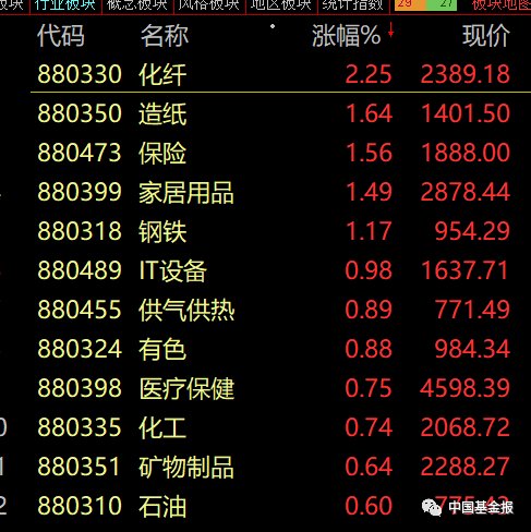 保险、造纸、医药、有色、钢铁、煤炭、电力、银行、酿酒等板块走强,旅游、农业、券商、半导体、汽车等板块走弱