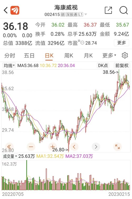 自2022年10月31日股价触底以来,海康威视股价底部不断抬升并站上年线,至今最大涨幅达43.88%,目前市值为3388亿元。