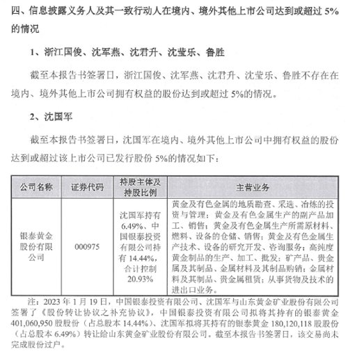 此前的2022年12月,沈国军及其控制的中国银泰投资有限公司,将其合计持有公司20.93%的股份全部转让给山东黄金。