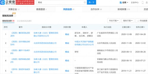 同时,戴威也因关联企业未履行法定义务,已被法院列为失信被执行人(老赖), 目前共有38条被限制高消费信息。