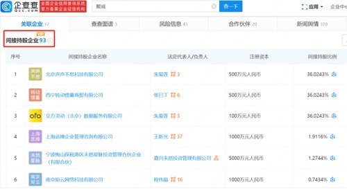 此外,通过股权投资戴威间接持有93家企业股权,商业版图涉及租赁和商务服务业、金融业、科研、IT等。