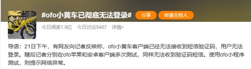 22日一早,“ofo小黄车已彻底无法登录”冲上微博热搜。截至目前,已经有1.9亿的阅读。