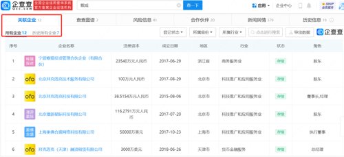 企查查APP显示,目前ofo小黄车创始人戴威关联有宁波唯猎投资管理合伙企业(有限合伙)、北京拜克洛克科技有限公司、上海奥佛合盛网络科技有限公司等12家公司,并在其中6家公司担任董事长、总经理、执行董事等职务。