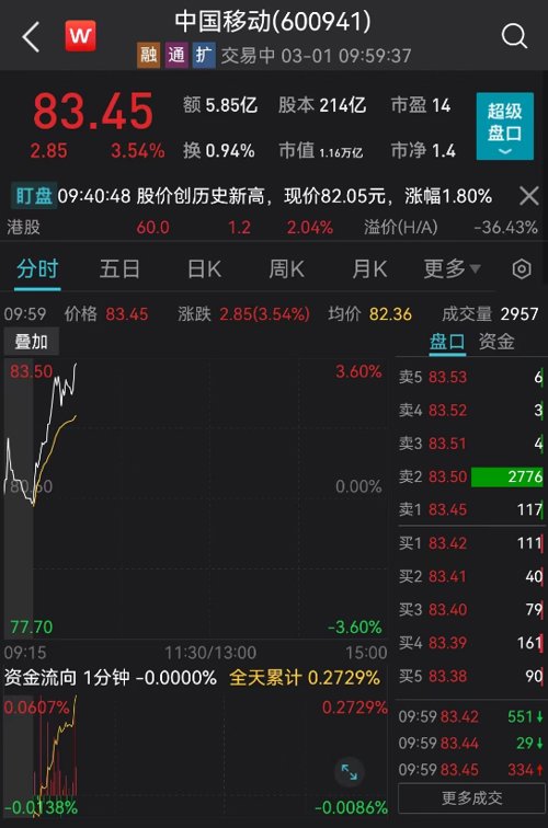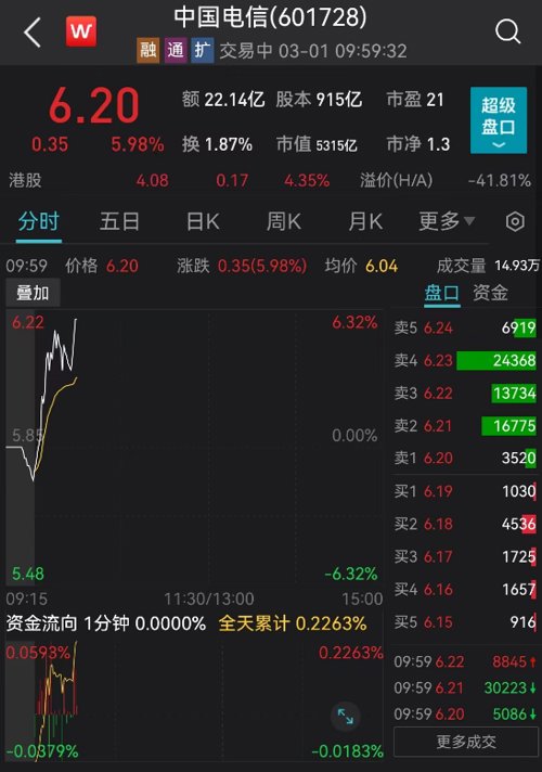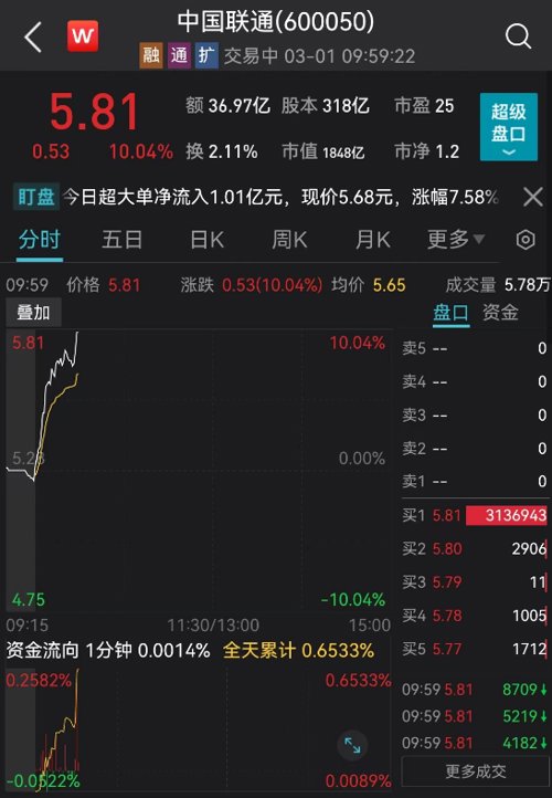 三大运营商继续飙涨,股价轮番创新高:中国联通强势封板,股价飙涨至5.81亿元,市值来到1848亿元。中国电信涨近6%,中国移动涨超3%,仍在上攻。