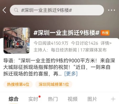 近日,一则来自拆迁现场的签约喜报飙上微博热搜。喜报显示,深圳一业主签约面积约9000平方米,共9栋。