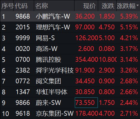 开盘后,恒指涨幅迅速扩大至1%,恒生科技涨超2%,科技股走高,小鹏汽车、理想汽车涨超5%,网易涨超4%。