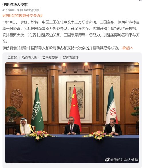 当日稍早时候,伊通社报道了这一消息,并发布了协议签署当时的视频画面。据伊通社报道,沙特、伊朗、中国在联合声明中表示,三国“将尽一切努力加强地区和国际的和平与安全”。