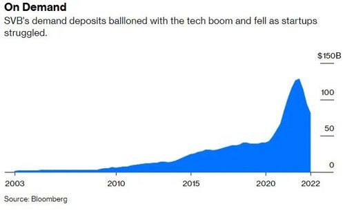 硅谷银行的主要客户集中于高科技企业和以及未盈利初创企业。在融资成本极低的时代,这些科技企业,尤其是初创科技企业获得了巨大融资支持。那些暂时用不到的钱,这些科技企业往往选择将钱存在硅谷银行。2020年美联储再度史无前例大放水,硅谷银行资产规模迅速扩张,从700多亿美元迅速膨胀到了约2000亿美元,硅谷银行的活期存款则在去年一度攀升至惊人的1280亿美元。