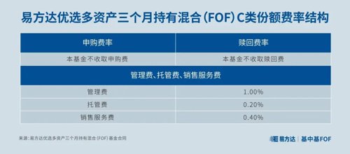 再看看C类份额的费用情况。仍然以易方达优选多资产三个月持有混合(FOF)为例,这只基中基的C类份额的费率结构如下: