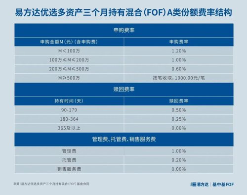 以易方达优选多资产三个月持有混合(FOF)为例,这只基中基的A类份额的费率结构如下: