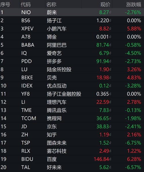 热门中概股涨跌不一,百度涨6.28%,世纪互联涨5.54%,嘉楠科技涨5.48%,贝壳涨4.83%,水滴公司涨3.75%,叮咚买菜涨3.34%,陆金所控股涨3.26%;跌幅方面,高途集团跌7.72%,晶科能源跌6.94%,图森未来跌6.75%,好未来跌6.57%,名创优品跌6.37%,爱奇艺跌4.5%。中概新能源汽车股涨跌互现,蔚来汽车跌2.76%,小鹏汽车涨5.88%,理想汽车涨2.78%。