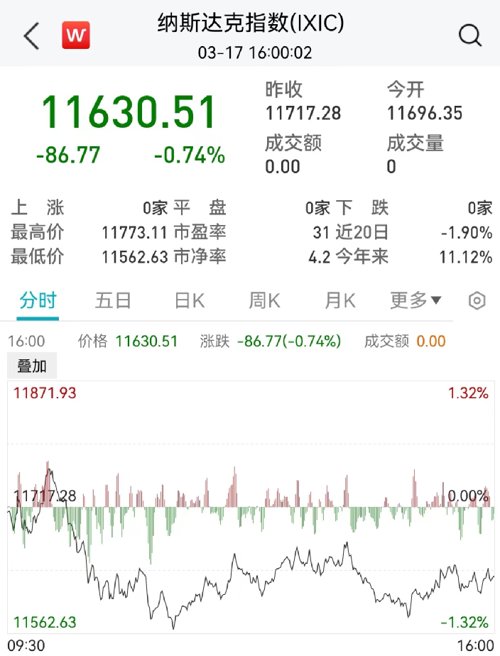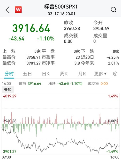 先看市场表现。当地时间3月17日,美国股市收盘全面下跌。道琼斯工业平均指数下跌384.57点,跌幅1.19%,收于31861.98点。标准普尔500指数下跌1.1%,收于3916.64点。纳斯达克综合指数下跌0.74%,至11630.51点。本周,道指跌0.15%,标普500指数涨1.43%,纳指涨4.41%。
