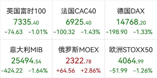 欧洲主要股指收盘全线下跌,德国DAX指数跌1.33%报14768.2点,法国CAC40指数跌1.43%报6925.4点,英国富时100指数跌1.01%报7335.4点,意大利富时MIB指数跌1.64%报25494.54点。本周,德国DAX指数跌4.28%,法国CAC40指数跌4.09%,英国富时100指数跌5.33%,意大利富时MIB指数跌6.55%。