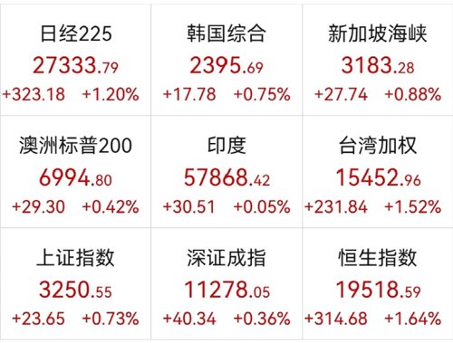 亚太方面,亚太股市主要股指收盘多数走高,韩国综合指数上涨0.75%报2395.69点,本周累计上涨0.04%;日经225指数涨1.2%报27333.79点,周跌2.88%;澳洲标普200指数涨0.42%,周跌2.01%;新西兰NZX50指数跌0.16%,周跌0.4%。
