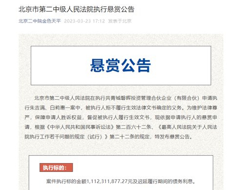 3月23日晚间,北京市二中院官微发布悬赏公告显示,在执行共青城磐晖投资管理合伙企业(有限合伙)申请执行朱吉满、白莉惠一案中,被执行人拒不履行生效法律文书确定的义务,特发布悬赏公告。