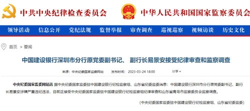 据中央纪委国家监委驻中国建设银行纪检监察组、山东省纪委监委消息:中国建设银行深圳市分行原党委副书记、副行长易景安涉嫌严重违纪违法,目前正接受中央纪委国家监委驻中国建设银行纪检监察组纪律审查和山东省青岛市监察委员会监察调查。