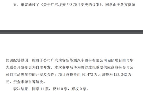广汽集团3月27日公告宣布,广汽埃安AH8项目由与华为联合开发变更为自主开发,变更后,华为将继续以重要供应商身份参与公司自主品牌车型的开发及合作。车企近年来竞相拥抱华为的大势中,广汽此次降低“含华量”,在市场中也是少有的“逆水行舟”之举。广汽集团是三家采用Huawei Inside模式合作的车企之一,另外两家分别为长安汽车和北汽集团。华为方面28日对该事件也向中国基金报记者作出回应:“该事件属于单一事件,与其他车企合作没有关联。”不过,也有业内人士表示,广汽弱化与华为合作关联早有迹象,除了技术层面因素外,其本身盈利能力不强,其对供应链需要更强的把控能力和话语权,以改善其在汽车制造环节的盈利能力。广汽集团公告显示,公司第六届董事会第35次会议审议通过了《关于广汽埃安AH8项目变更的议案》。同意由于各方资源的调配等原因,控股子公司广汽埃安新能源汽车股份有限公司AH8项目由与华为联合开发变更为自主开发,本次变更后华为将继续以重要供应商身份参与公司自主品牌车型的开发及合作;项目总投资由9.25亿元调整为12.33亿元,资金来源自筹解决。