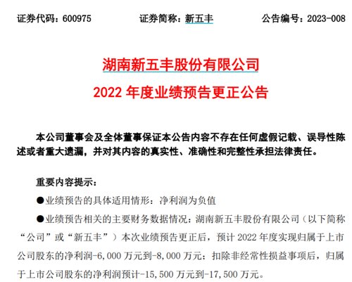 2、新五丰:下修业绩预告 2022年净利预亏6000万元-8000万元