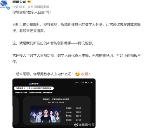 腾讯正式发布全新的AI智能创作助手“腾讯智影”,推出了智影数字人、文本配音、文章转视频等AI创作工具。其中,智影数字人能实现“形象克隆”和“声音克隆”,创作者通过上传少量图片、视频和音频素材,就能得到自己的数字人分身和定制音色,进而快速生成自己的数字人播报视频。