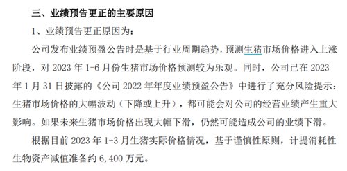 新五丰披露业绩预告更正公告,预计2022年净利润亏损6000万元至8000万元;公司根据目前2023年1-3月生猪实际价格情况,基于谨慎性原则,计提消耗性生物资产减值准备约6400万元。此前,公司预计2022年净利润800万元到1200万元。