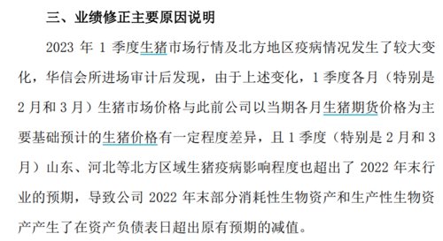 新希望公告,大幅下修业绩预告,2022年预计净亏损13.5亿元-15.5亿元,此前预计净亏损4.1亿元-6.1亿元;2023年1季度生猪市场行情及北方地区疫病情况发生了较大变化,公司拟就对2022年12月31日的生物资产超出原有预期外部分的减值进行计提,共计约12.35亿元。