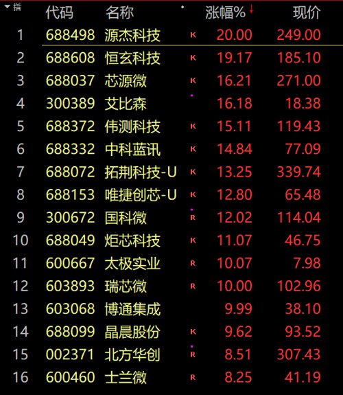 今天最火的板块是半导体。全线爆发,但午后涨幅有所收窄,源杰科技、雅克科技、瑞芯微、博通集成、太极实业等涨停,恒玄科技、伟测科技、芯源微、国科微等十余股涨超10%。