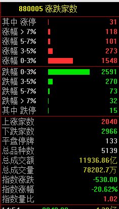 一共2040只个股上涨,2966只个股下跌。