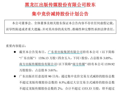 无独有偶,4月6日,第三大股东广东省出版集团和第四大股东南方传媒纷纷表示,两家合计减持不超过1778万股龙版传媒。