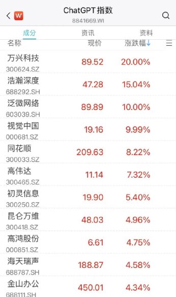 AI、ChatGPT概念走高,万兴科技20CM涨停,视觉中国连续涨停,浩瀚深度、泛微网络、同花顺等跟涨。