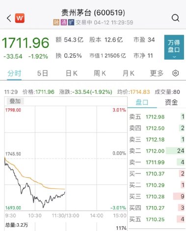 大消费板块盘中持续走弱,白酒、食品饮料方向领跌,贵州茅台股价一度跌破1700元关口,创年内新低,目前报1711.96元。