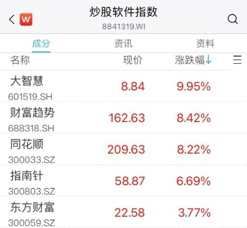 此外炒股软件个股拉升,大智慧、财富趋势、同花顺、指南针等均大幅上涨。