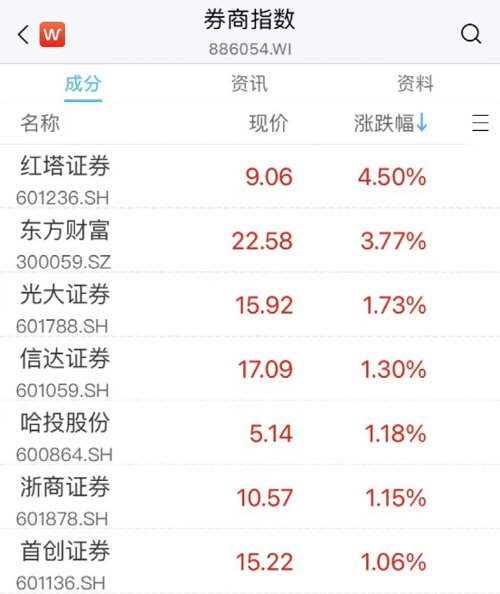 临近午盘,券商股异动拉升。其中红塔证券涨4.5%,东方财富涨超3%,光大证券、信达证券、浙商证券等跟涨。