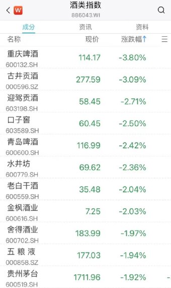 李子园大跌5%,劲仔食品、安井食品、重庆啤酒、古井贡酒等跌超3%。
