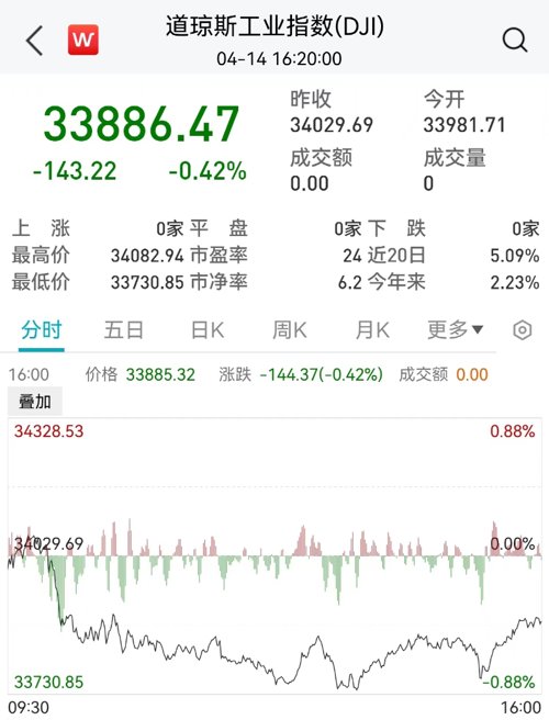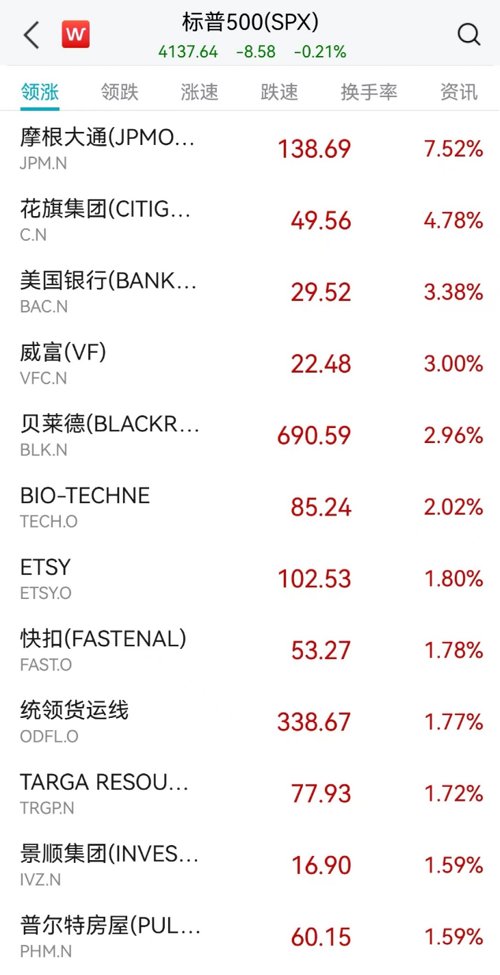 美股高开低走,银行股普涨;摩根大通利润“狂飙”52%,股价大涨7.6%;热门中概股多数下跌。