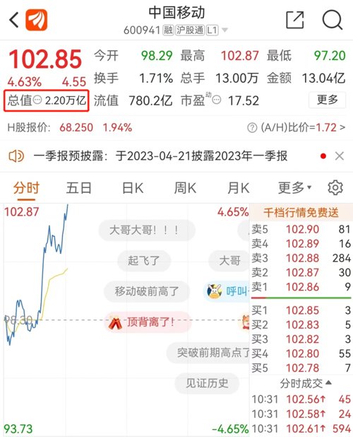 17日早盘,中字头大涨。中国移动盘中狂拉超4%,总市值2.2万亿,超过贵州茅台,成为新任“总市值一哥”。