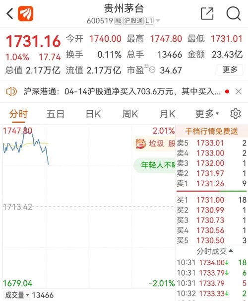 贵州茅台早盘拉升2%之后,涨幅回调,截止发稿总市值为2.17万亿。