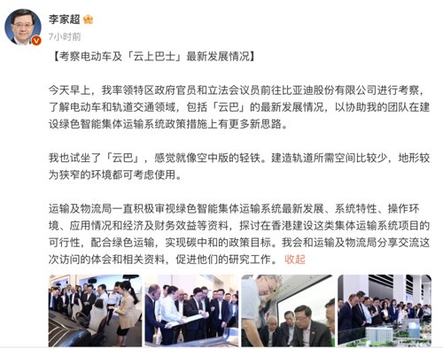 4月22日早上,李家超率领代表团到比亚迪股份有限公司位于深圳的总部考察,了解该公司在汽车、轨道交通、新能源和电子等领域的最新发展,并体验立体智能交通系统“云巴”。