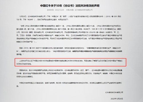 2022年12月29日,中国红牛发布关于50年《协议书》法院判决有效的声明。其中显示,公司收到广东省深圳前海合作区人民法院民事判决书,其中认定了中国红牛自1995年始享有在中国境内独家经营红牛饮料50年的合法性。“只有中国红牛有权在中国境内生产、销售红牛饮料。未经书面同意或许可之前,泰国天丝不得在中国境内生产或承包给其它公司生产或销售红牛饮料同类产品。”