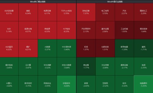 板块方面来看,光伏、储能、电源设备等新能源板块反弹,软件、AI算力、网络安全等跌幅居前。