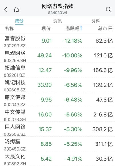 网络游戏股电魂网络跌停,读客文化跌超10%,拓维信息、姚记科技、慈文传媒等跌超5%。